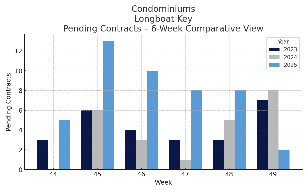 Source of data is Stellar MLS for the property types Condominiums (Condominiums and Townhouses) and Single-Family Homes (Single-Family Homes and Villas) in ZIP 34228 over the past 6 weeks ended 12-6-2025 and the same comparable period in 2024 and 2023. Pendings are homes listed for sale that have been placed under contract. The current number of new pendings is one of the best measures of current market activity. The graphs show that activity for each of the past 6 weeks vs comparable weeks in the prior 2 years.