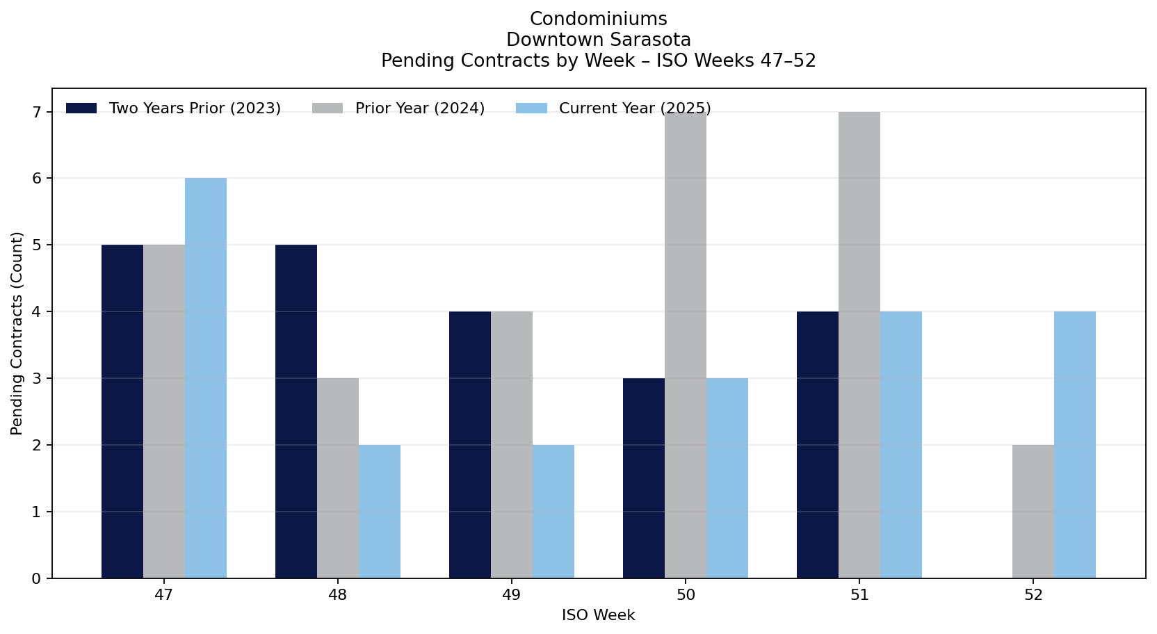 Source of data is Stellar MLS for the property types Condominiums and Townhouses in ZIP 34236 over the past 6 weeks ended 12-27-2025 and the same comparable period in 2024 and 2023. Pendings are homes listed for sale that have been placed under contract. The current number of new pendings is one of the best measures of current market activity. The data excludes new construction.