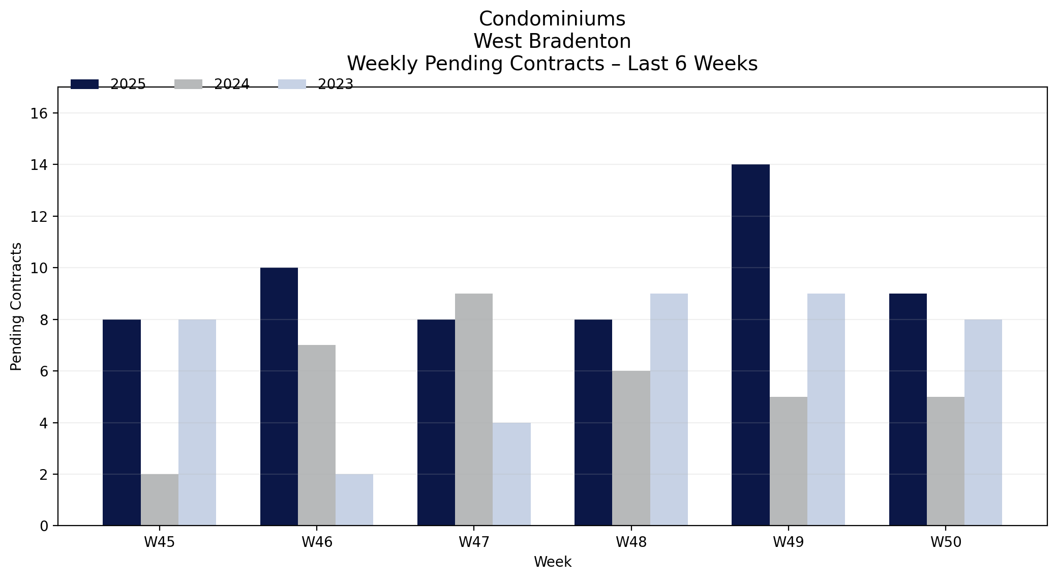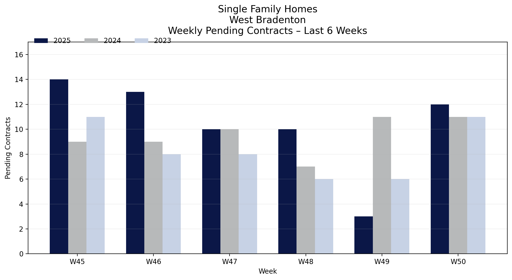 Source of data is Stellar MLS for the property types Condominiums (Condominiums and Townhouses) and Single Family Homes (Single Family Homes + Villas) in ZIP 34209, 34210, 34215 (excluding new construction) over the past 6 weeks ended 12-13-2025 and the same comparable period in 2024 and 2023. Pendings are homes listed for sale that have been placed under contract. The current number of new pendings is one of the best measures of current market activity. The graphs show that activity for each of the past 6 weeks vs comparable weeks in the prior 2 years.